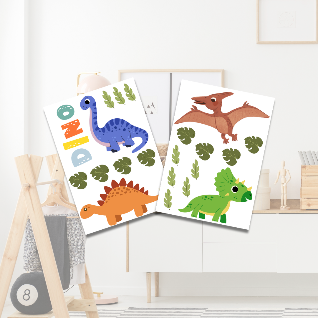 • 2 cartelas contém 4 dinossauros entre 9,5cm e 15,5cm, 8 folhas 4cm, 8 folhas de 4,7cm e uma palavra "DINO" de aproximadamente 14x6cm.
