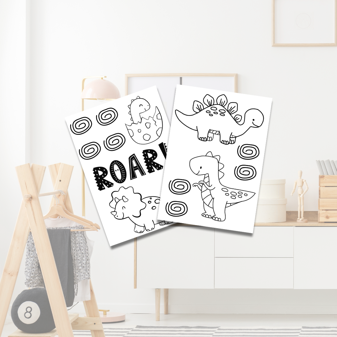 • 2 cartelas contém 4 dinossauros entre 10,5cm e 15,5cm, 8 labirintos de aproximadamente 4x5,5cM  e uma palavra "ROAR" de aproximadamente 17X5,5cm.