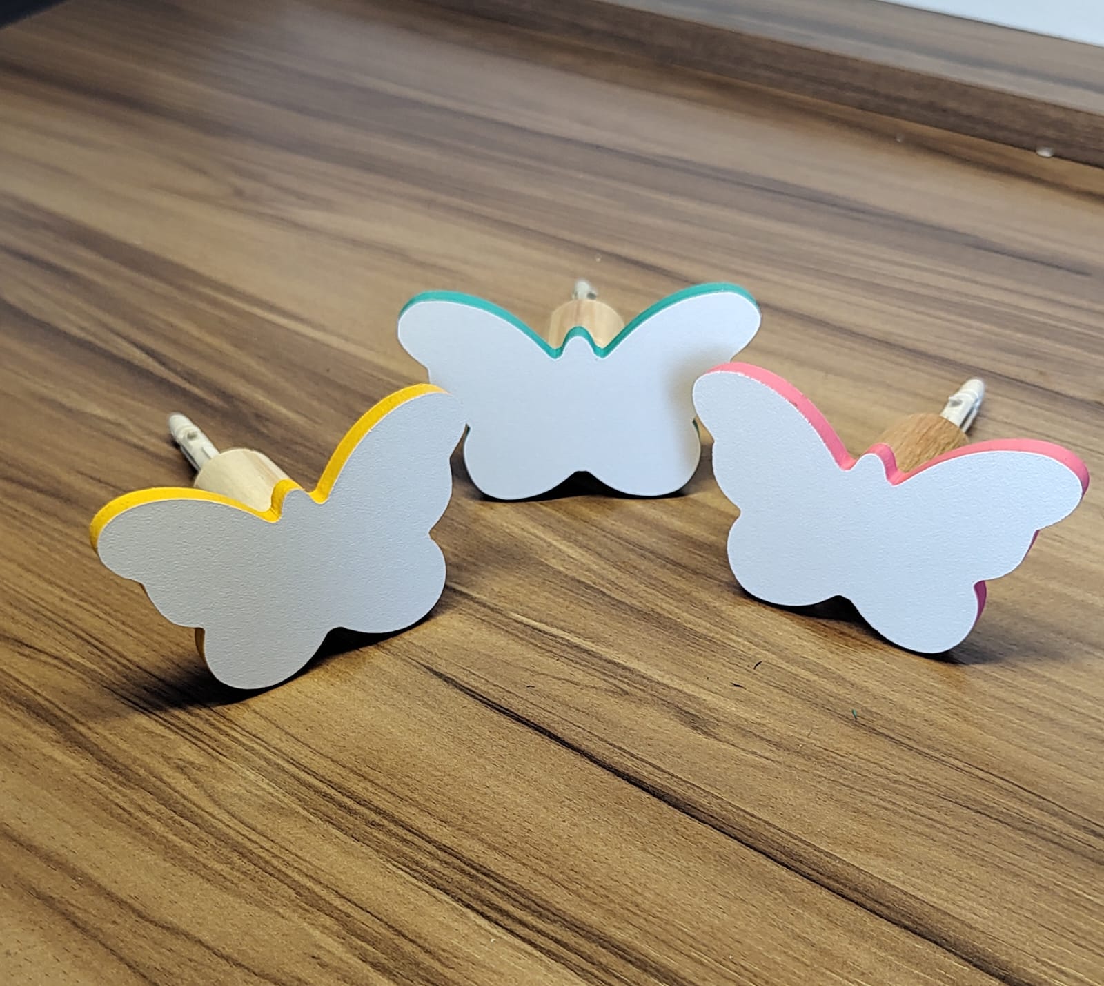 • Kit formado por uma borboleta branca com rosa, uma branca com amarela e uma branca com verde.